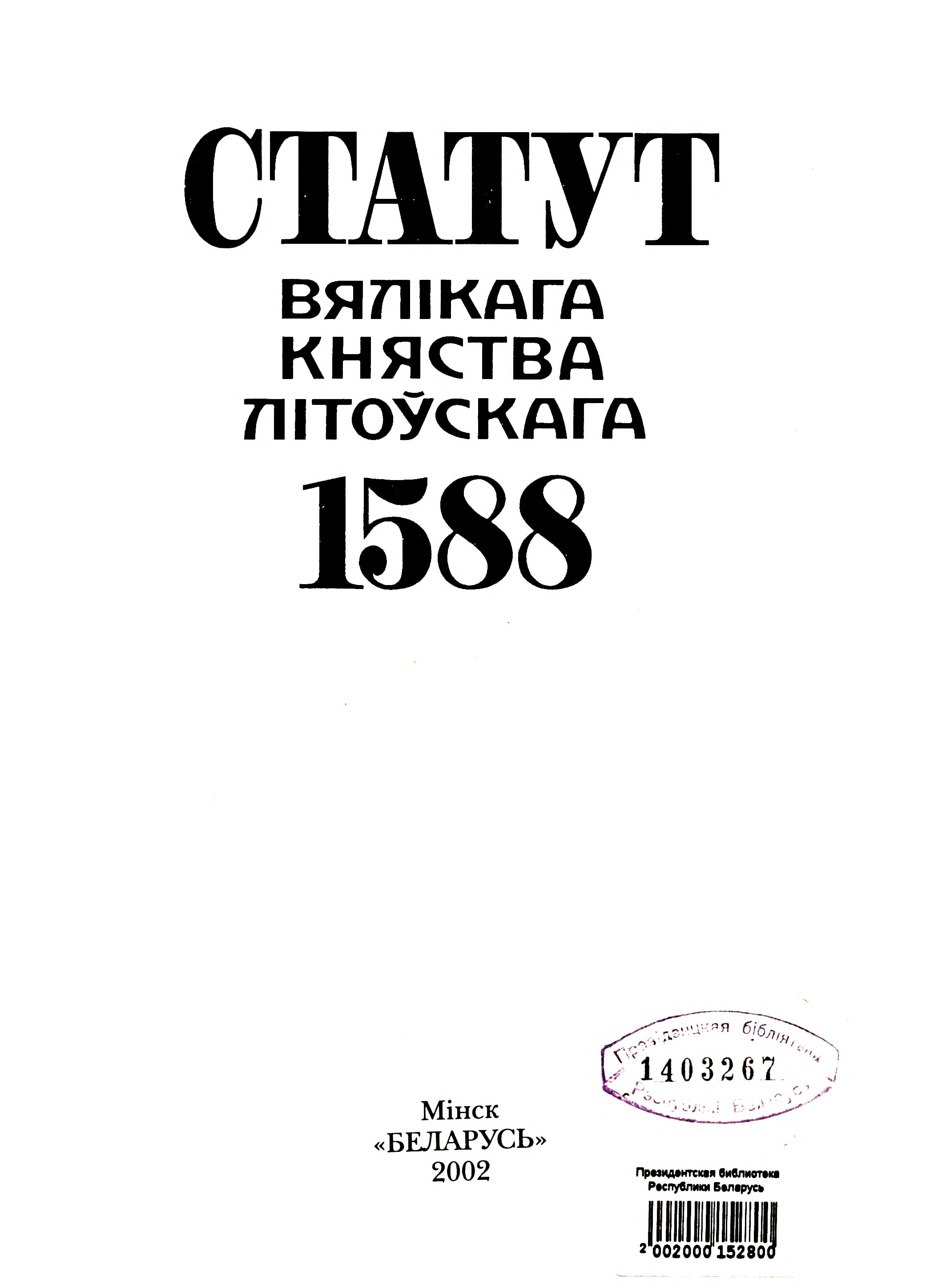 Статут Вялікага княства Літоўскага 1588 / пераклад на суч. бел. мову А. С. Шагун. — Мінск : Беларусь, 2002. — 207 с. : іл.