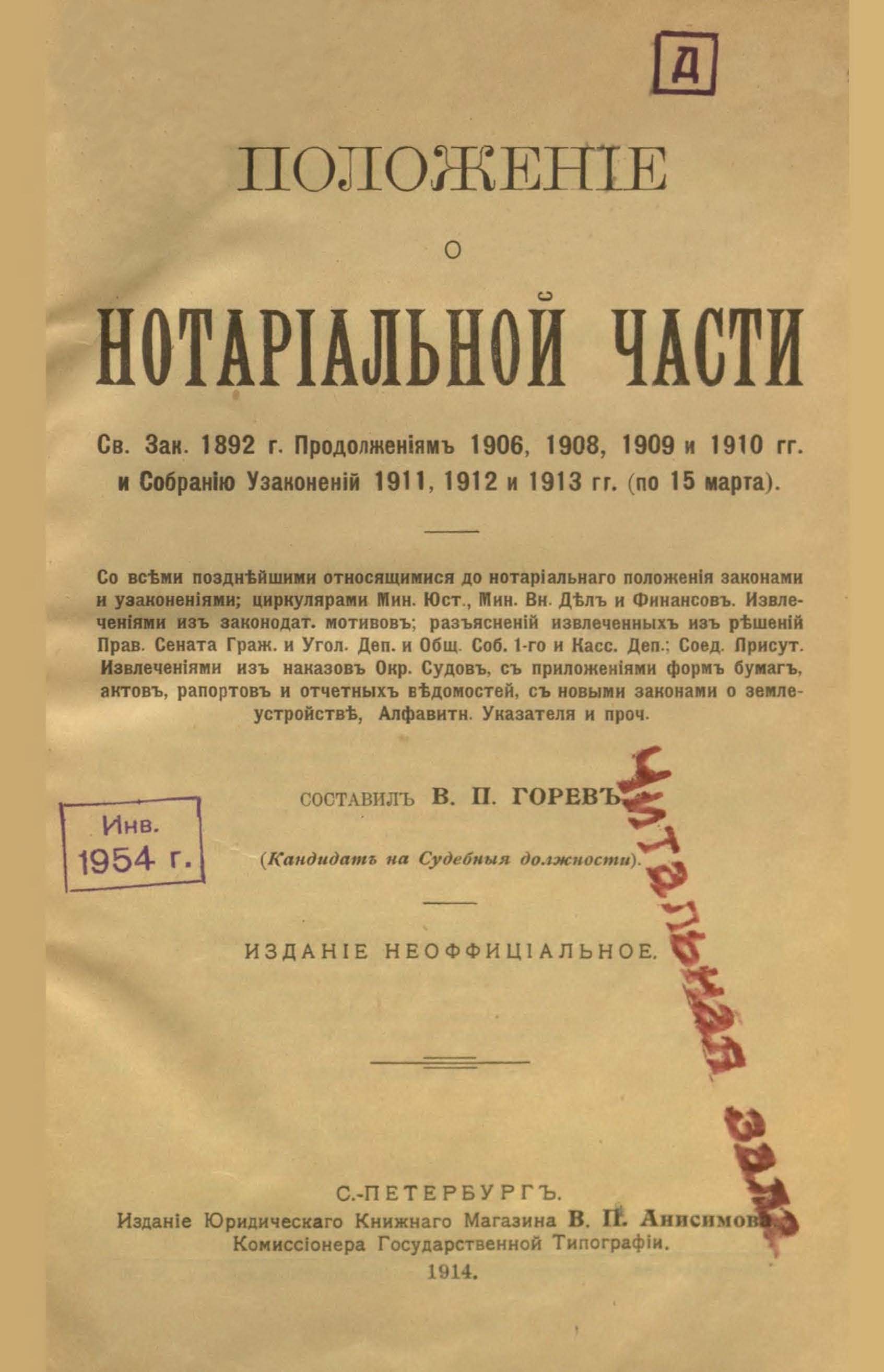 Положеніе о нотаріальной части : изданіе неофіціальное / сост. В. П. Горевъ . - С.-Петербургъ, 1914.